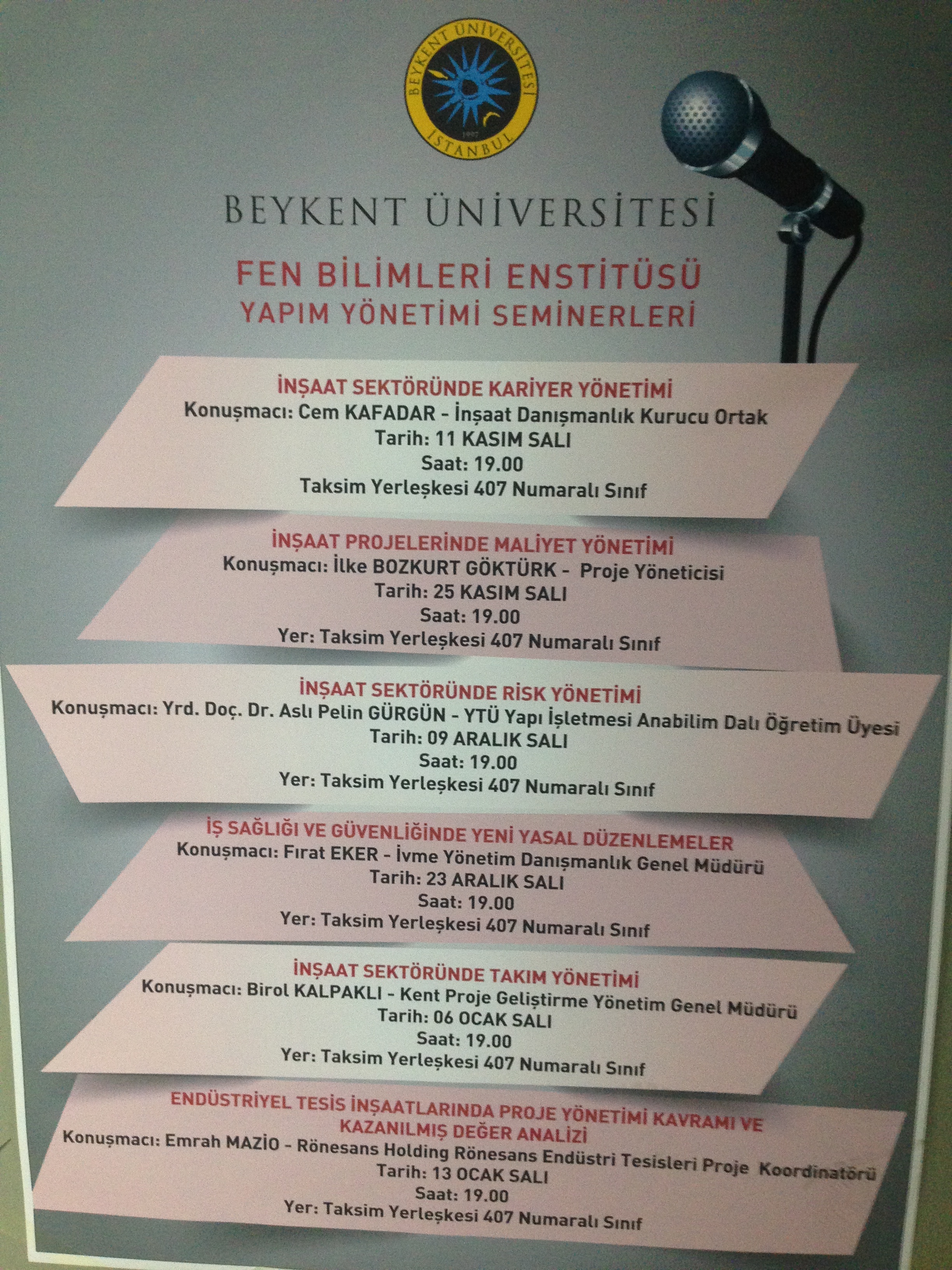 Beykent Ünv. Fen Bilimleri Enstitüsü Yapım Yönetimi Seminerleri Posted on 14 Kasım 2014 by Cem Kafadar Ilkokulda’da da ismim tahtaya konuşanlar listesinde yazılırdı, değişen bir şey yok 🙂 Bunu paylaş: X'te paylaşmak için tıklayın (Yeni pencerede açılır) X Facebook'ta paylaşmak için tıklayın (Yeni pencerede açılır) Facebook Beğen Yükleniyor... İlgili
