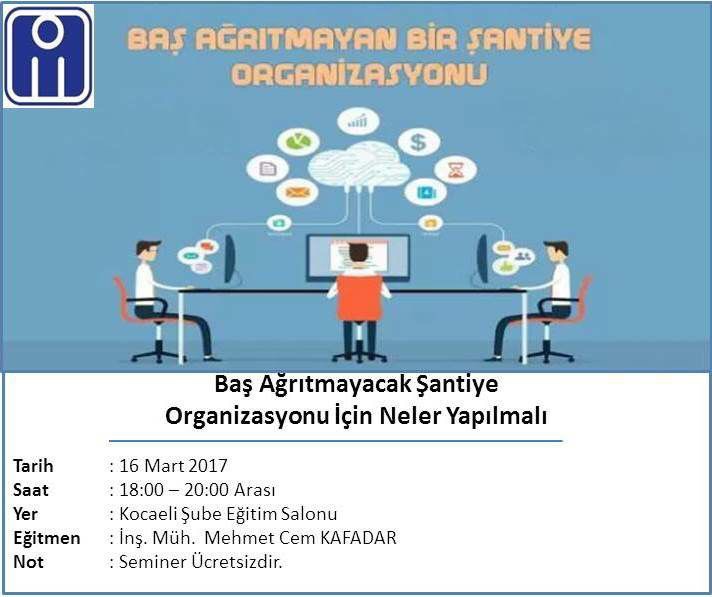 IMO Kocaeli Şubesinde vereceğim “Baş Ağrıtmayacak Bir Şantiye Organizasyonu İçin Neler Yapılmalı” seminerim 16 Mart Saat: 18:00 Posted on 14 Mart 2017 by Cem Kafadar Bunu paylaş: X'te paylaşmak için tıklayın (Yeni pencerede açılır) X Facebook'ta paylaşmak için tıklayın (Yeni pencerede açılır) Facebook Beğen Yükleniyor... İlgili