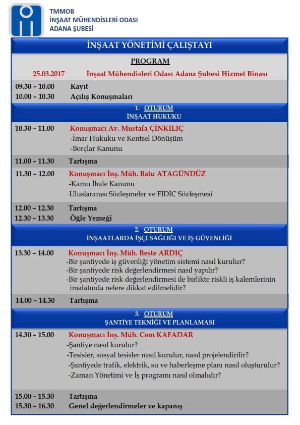 İMO Adana Şubede gerçekleşecek İnşaat Yönetimi Çalıştayı’nda yapacağım “Şantiye Tekniği ve Planlaması” konuşmam hakkında 25.03.2017 Posted on 17 Mart 2017 by Cem Kafadar 25 Mart Cumartesi günü, Şube hizmet binamızda İnşaat Yönetimi Çalıştayı yapılacaktır. Katılımınızı bekliyoruz. Bunu paylaş: X'te paylaşmak için tıklayın (Yeni pencerede açılır) X Facebook'ta paylaşmak için tıklayın (Yeni pencerede açılır) Facebook Beğen Yükleniyor... İlgili