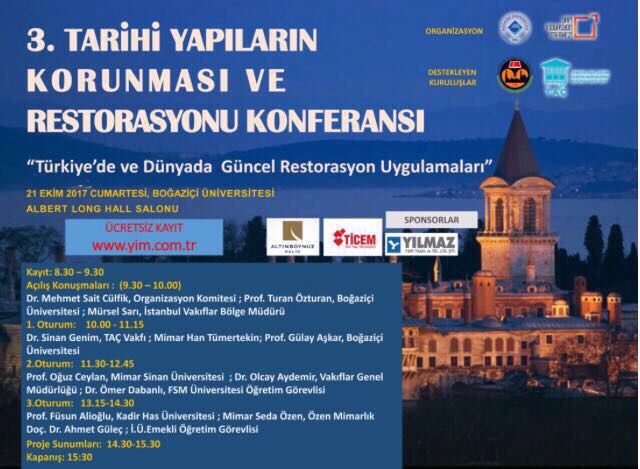 3. Tarihi Yapıların Korunması ve Restorasyonu Konferansı Posted on 5 Ekim 2017 by Cem Kafadar Bunu paylaş: X'te paylaşmak için tıklayın (Yeni pencerede açılır) X Facebook'ta paylaşmak için tıklayın (Yeni pencerede açılır) Facebook Beğen Yükleniyor... İlgili
