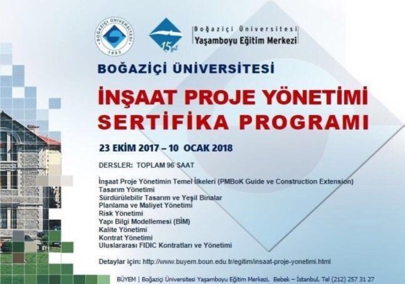 İnşaat Proje Yönetimi Sertifika Programı – Boğaziçi Üniversitesi Posted on 5 Ekim 2017 by Cem Kafadar Bunu paylaş: X'te paylaşmak için tıklayın (Yeni pencerede açılır) X Facebook'ta paylaşmak için tıklayın (Yeni pencerede açılır) Facebook Beğen Yükleniyor... İlgili