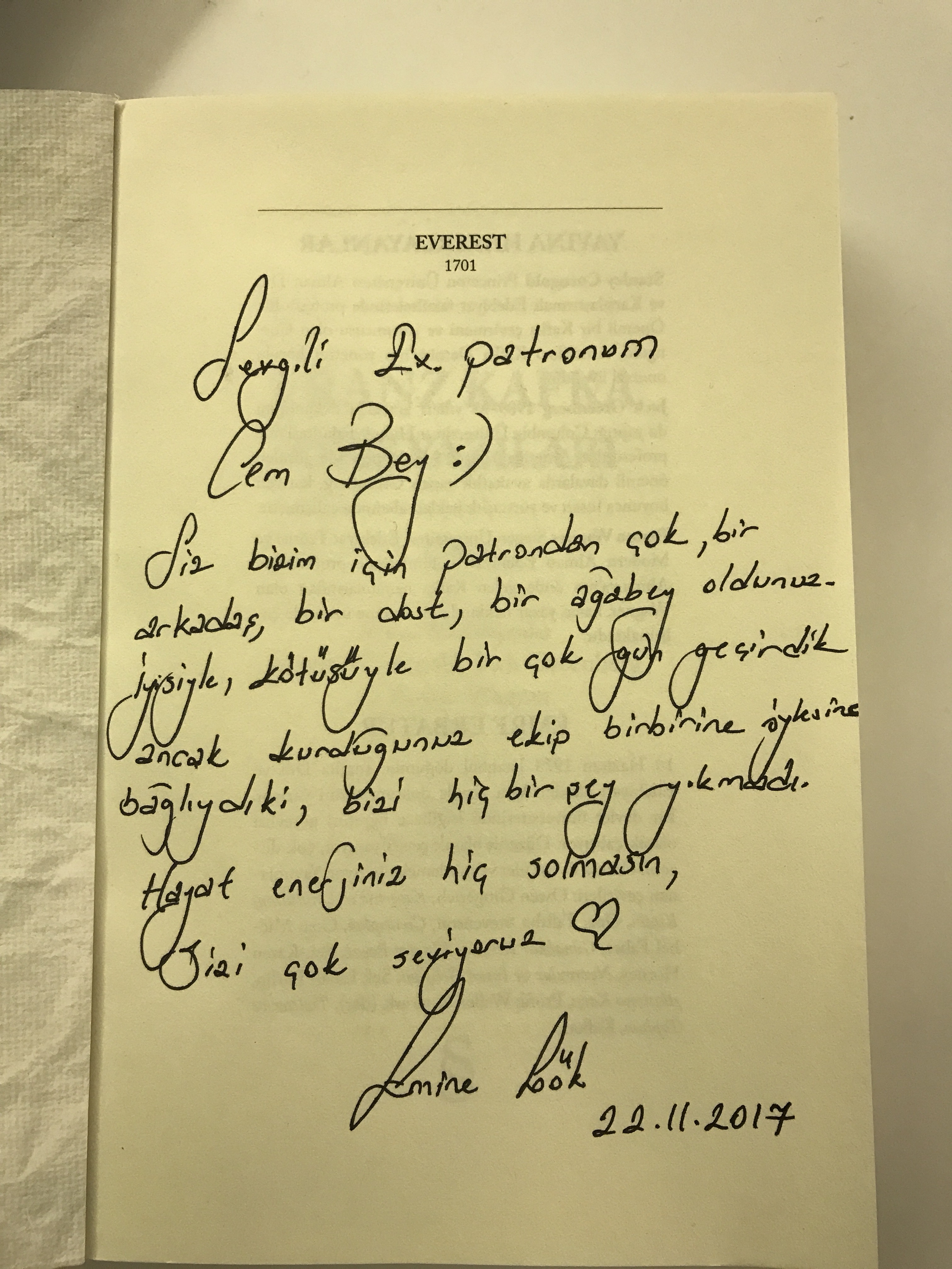 2013’ün son günlerinde üst üste yaşadığım bir sürü tuhaf olumsuzluğun ardından seninle hiç hesapta olmayan bir şekilde tanıştık ve o günlerdeki kötü gidişe bir şekilde dur dedik. Ardından da hep beraber 1inşaat Danışmanlık’ta rengarenk bir sayfa açtık ve o günden bugüne de o sayfaların üzerine yenilerini ekleyerek devam ediyoruz yolculuğumuza. Yazdıklarınla beni çok mutlu ettin, Emine’ciğim. Sana da, karşıma böylesine güzel insanları çıkaran kaderime de teşekkür ediyorum.