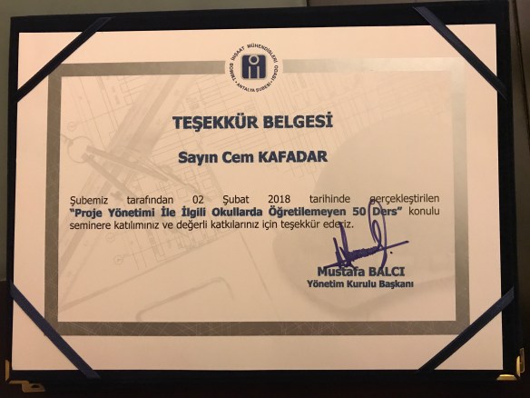 Dün İmo Antalya Şubesinde gerçekleşen “Proje Yönetimi ile ilgili okullarda öğretilmeyen 50 ders “seminerini sunan, can alıcı noktalara değinerek bizleri bilgilendiren değerli meslektaşımız Cem Kafadar hocama , sıcak sohbeti ve konukseverliğinden ötürü İmo Antalya şube Başkanı Mustafa Balcı ya çok teşekkür ederim.