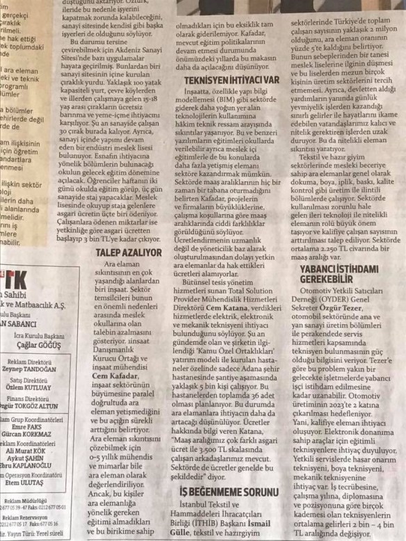 Hürriyet IK Gazetesinde yayınlanan “İşsizlik Artıyor Ara Eleman Bulunamıyor” konulu haberin içinde yer alan açıklamalarım