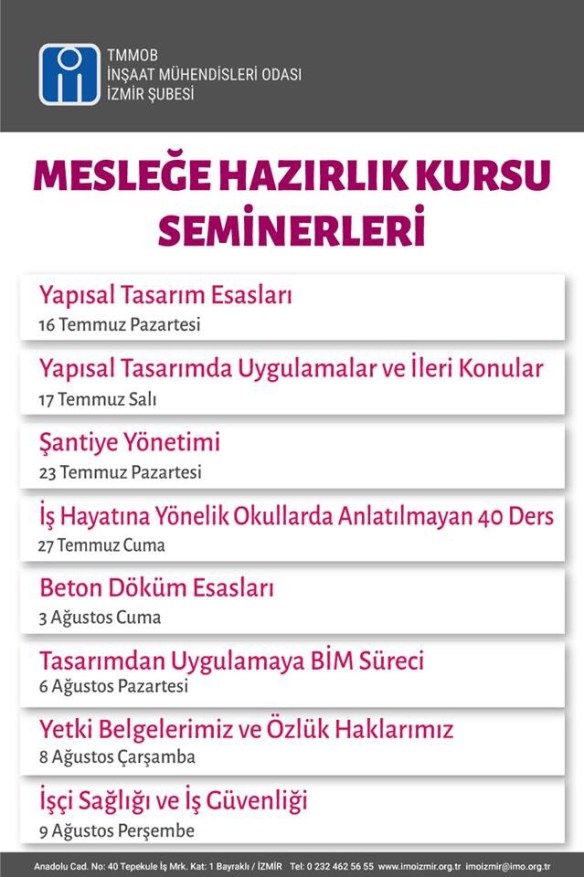 27 Temmuz Cuma günü saat 18.00’de İnşaat Mühendisleri Odası İzmir Şubede “İş Hayatına Yönelik Okullarda Anlatılmayan 40 Ders” konulu bir seminer vereceğim. 28 Temmuz Cumartesi günü de saat 13.00 – 15.00 arasında Gümüldür Tabiat Kampında Genç İnşaat Mühendisi arkadaşlarla “Sanat, hayatımızı nasıl zenginleştirir?” konulu bir atölye çalışmamız olacak. İzmir ve çevresindeki vakti müsait olan tüm dostlarımı bekliyorum.