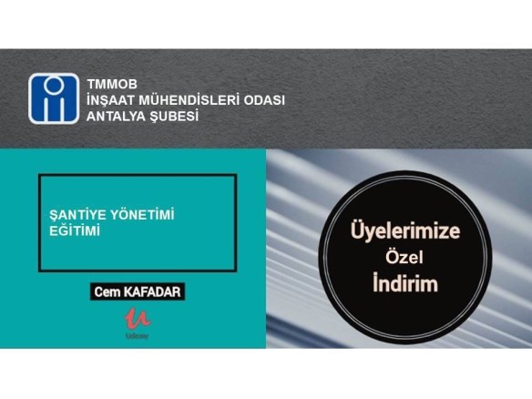 İnşaat Mühendisi Cem Kafadar`ın Udemy üzerinde yayınlanan yaklaşık 7 saatlik “Şantiye Yönetimi” eğitimini İnşaat Mühendisleri Odası Antalya Şubesi üyeleri “IMOANTALYA” kupon kodunu kullanarak 409.99 TL yerine özel indirim ile 39.99 TL ücretle alabilirler.