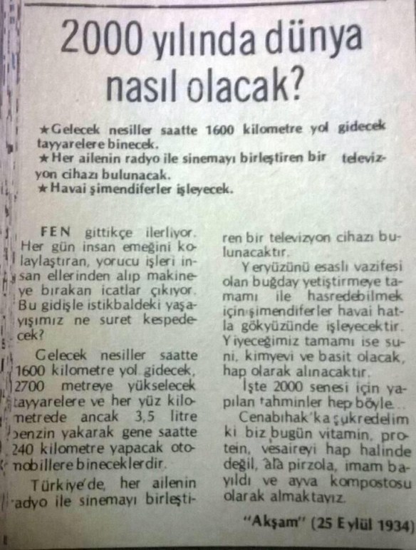 2000 yılında Dünya Nasıl Olacak? Posted on 15 Şubat 2019 by Cem Kafadar “2000 yılında Dünya Nasıl Olacak?” 1934 yılında yayınlanan bir gazeteden, son paragraf cok ilginç 🙂 Bunu paylaş: X'te paylaşmak için tıklayın (Yeni pencerede açılır) X Facebook'ta paylaşmak için tıklayın (Yeni pencerede açılır) Facebook Beğen Yükleniyor... İlgili