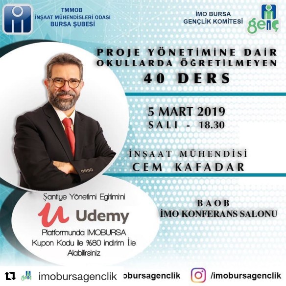 05 Mart Salı günü Bursa’dayım. Bursalı İnşaat Mühendisi arkadaşlarla İMO Konferans Salonunda proje yönetiminin şantiye uygulamalarını konuşacağız. Programı uygun olan tüm Bursalı dostlarımı beklerim 😊