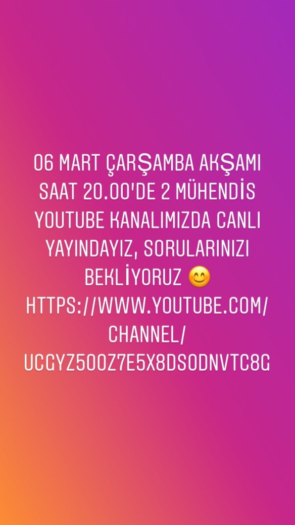 06 Mart Çarşamba akşamı saat 20.00’de 2 Mühendis YouTube Kanalımızda canlı yayındayız, sorularınızı bekliyoruz 😊