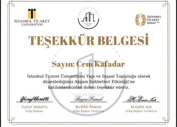 Bu belgenin benim için çok farklı bir anlamı var. İstanbul Ticaret Üniversitesi’nde bu akşam katıldığım canlı yayın sonrasında aldığım ilk sanal teşekkür belgesi. Ben de arkadaşlarla böyle güzel bir organizasyon serisine beni de davet ettikleri ve üst üste sordukları zihin açıcı soruları için teşekkür ederim.