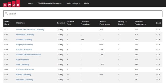Dünyada ilk 1000 üniversite içinde bulunan üniversitelerimiz. Bilkent dışında hepsi devlet üniversitesi.