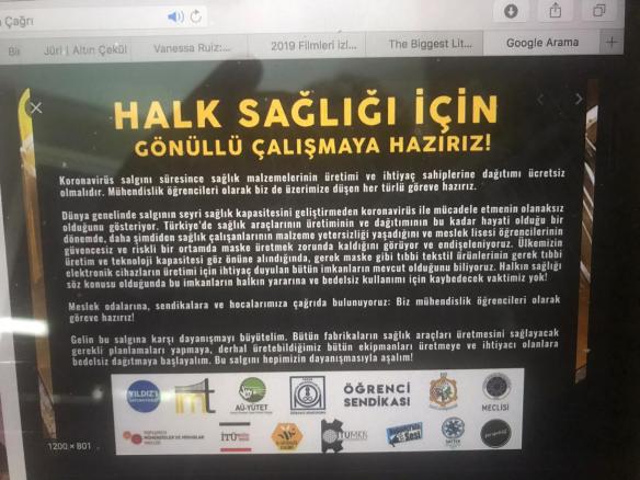 Mühendislik öğrencileri, koronavirüsün Türkiye’yi hızla etkisi altına aldığı dönemde “Halkın sağlığı için gönüllü çalışmaya hazırız” diyerek, salgınla mücadelede kullanılması gereken sağlık araçlarının üretimi için meslek odalarına, sendikalara ve hocalara çağrıda bulundu.