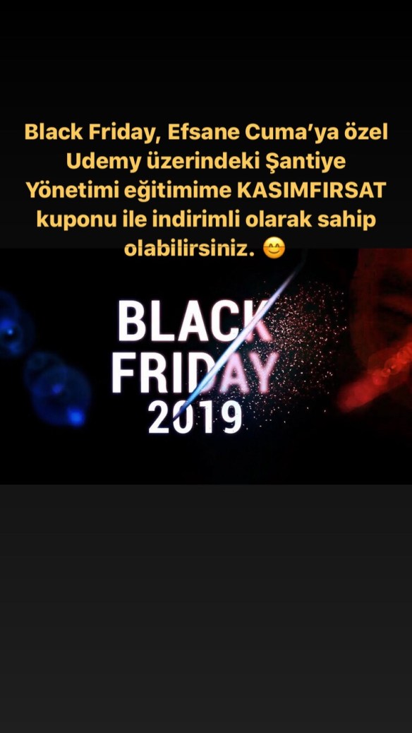 Black Friday, Efsane Cuma’ya özel Udemy üzerindeki Şantiye Yönetimi eğitimime KASIMFIRSAT kuponu ile indirimli olarak sahip olabilirsiniz. 😊