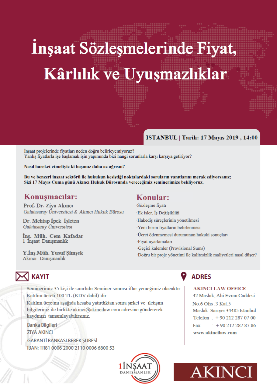 Bu ve benzeri inşaat sektörü ile hukukun kesiştiği noktalardaki soruların yanıtlarını merak ediyorsanız sizi 17 Mayıs günü Akıncı Hukuk Bürosunda vereceğimiz seminerlerimize bekliyoruz.