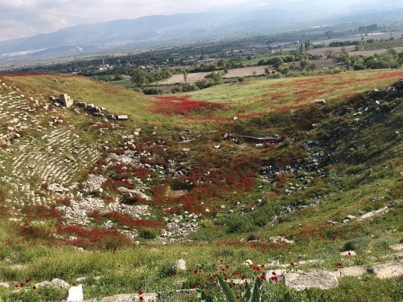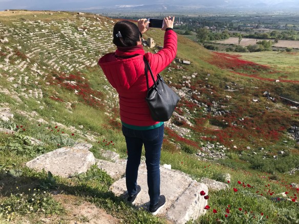 Epiktetos’un MS 1. yüzyılda kayalara oyularak yazılı şiiri maalesef bizim define avcılarının o kayanın ardında saklı bir hazine olabileceği düşüncesi ile patlatılmış. Patlatılan noktanın çevresinde şiirin bir kısmı görülüyor. Şiirde Hierapolis’li Epiktetos’a övgülerin olması, Epiktetos’un felsefesine ters gibi geldi bana. Sanki bir hayranı bu şiiri ona yazmış diye düşündüm.
