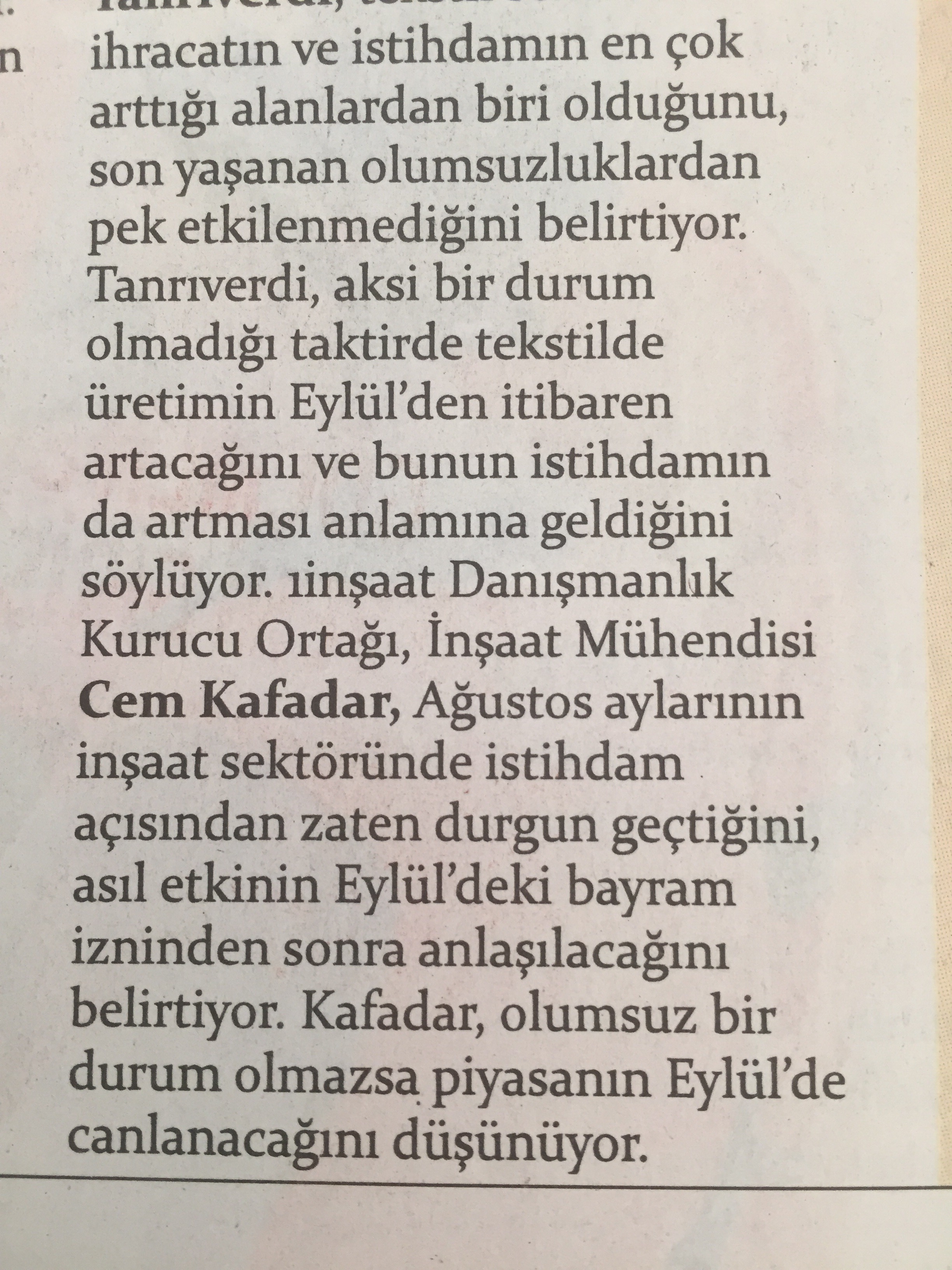 Bugünkü Hürriyet IK Gazetesinde yayınlanan “OHAL İstihdamı Nasıl Etkiledi” konulu haberin içinde yer alan kısa açıklamam. Ben, bir çok olumsuzluğu da dile getirdim ama habere ayrılan yer kısa olduğu için bu kadarını almışlar. Şu anda herkes “bekle gör” modunda, tüm bu yaşadıklarımızın üzerine artçılar gelmez ise zaten dipte olduğumuz için bayram sonrası hafif de olsa olumlu bir kıpırdanma olacaktır diye düşünüyorum. Ama çok açık bir gerçek var ki yabancı yatırımcıyı çok korkuttuk, onların tekrar dönmesi biraz zaman alacaktır. İyi Pazarlar 😊