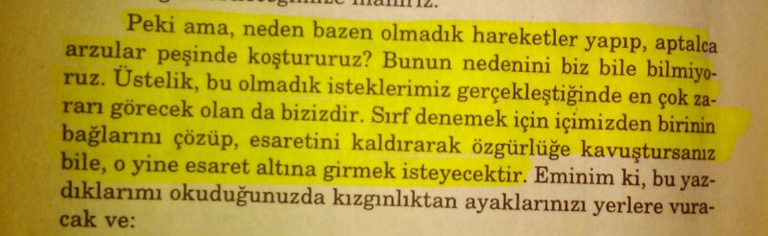 İnsan her zaman ve her yerde, aklının ve çıkarının gösterdiği değil de, canının istediği yoldan yürümeyi sever. çıkarımızın tam tersi şeyleri de isteyebiliriz, hatta bazen kesinlikle böyle olmalıdır.